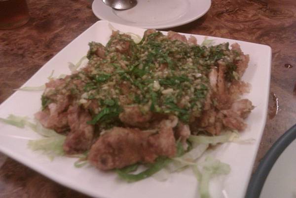 但是上面的香料還是很夠味 淋在炸得酥脆的雞肉上