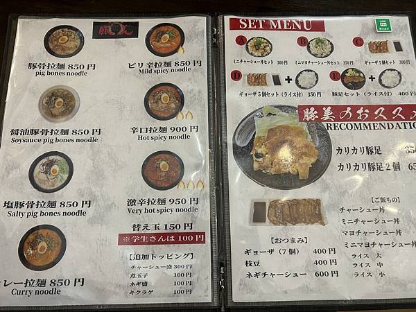 今天在水前寺成趣園附近的「豚美」拉麵店用餐。店內的菜單很單純,只有如文章最後附的照片一樣的品項。拉麵的湯頭都是以九州主流的豚骨為基底,搭配上鹽味、醬油、辛辣以及少見的咖哩口味。配菜則是有叉燒飯、煎腳,以及在我第一次在日本看到的豬腳。