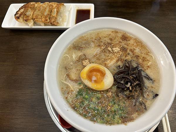 我今天點了醬油豚骨拉麵,配料有木耳絲、蔥花、半熟蛋以及叉燒肉片。湯頭還不錯,以我目前在熊本吃到的豚骨拉麵來說,已經算是不會太鹹的湯頭了。麵條是細麵,與配料及湯頭一起入口,整體吃起來的感覺相當和諧。煎餃吃起來也不錯,雖然份量不算大,但內餡調味相當平衡,外皮也煎得夠酥脆