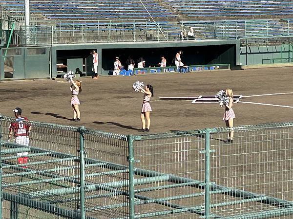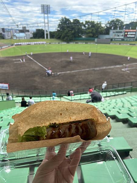 因為進場後發現沒有便當,我就又到場外的飲食區買了500円一份的飯團肉捲,以及投了販賣機的飲料回到座位上。整個球場觀眾不算多,稍微數過後可能不到兩百人,其中應該還有一部份是今天要來表演的小朋友的親友。