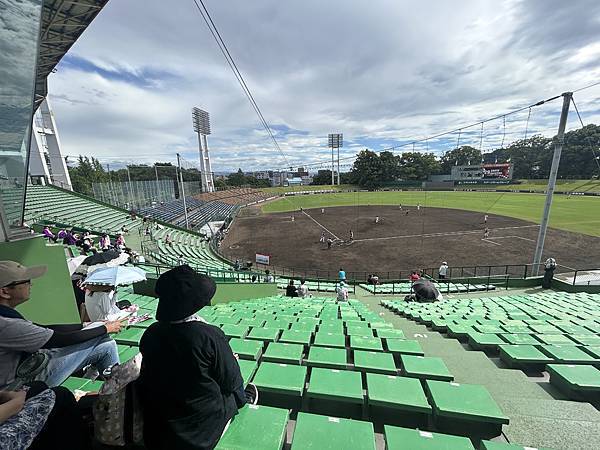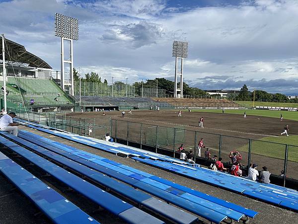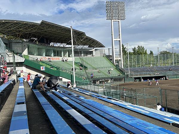 進到場內後,我有看到賣便當的看板,但是沒有看到便當。不確定那時其他活動時留下來的告示,還是現場的便當已經賣完了 (我們是差不多比賽開打五分鐘後進場的),球場本身分為本後和一/三壘三個大區域,椅子都是基本款沒有靠背的塑膠椅。外野的部份則是一片大草皮可以讓球迷輕鬆看球。不過球場的設計沒有屋簷遮蔽,比賽又是在八月份的下午三點開打,氣候實在是炎熱到讓人眼冒金星,因此觀眾要不都跑到了最上排,稍微有一點陰影的地方,不然就是直接在座位打上陽傘看球