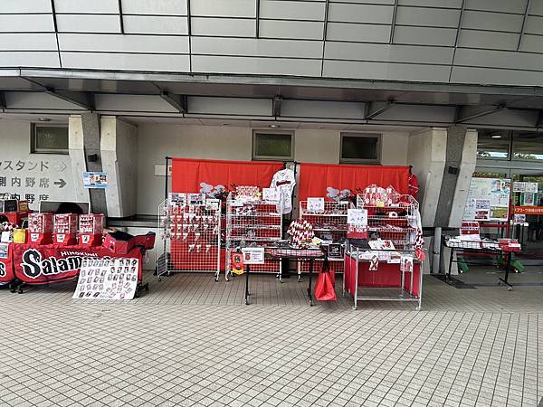 一到球場就有看到一些簡單的球隊主題視覺布置,沿著樓梯走上二樓,先到一旁的售票處買了門票 (大人 1500 円 / 高中以下 1000円 / 學齡前免費)。進到入口後,在廣場上有一些簡單的球隊商品擺售,基本的球衣、帽子、T-Shirt、徽章、扭蛋、加油棒這些都有。另一頭有唯一的餐飲攤位,有賣一些飲料跟食物。旁邊還有兩隻大型的吉祥物充氣玩偶供大家拍照