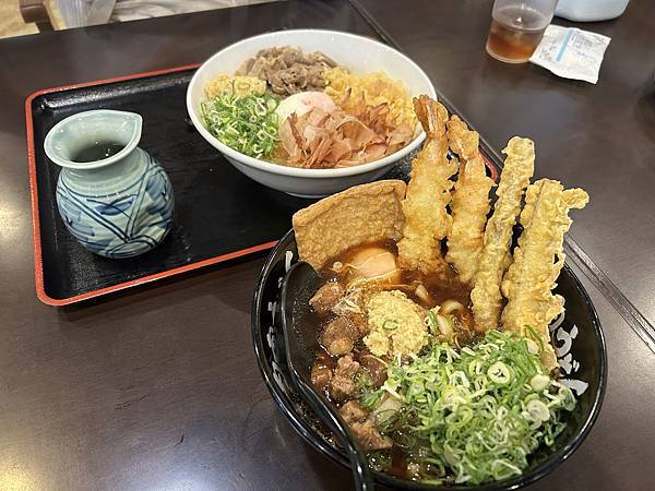我們今天點的是肉玉 ぶっかけうどん (891円) 跟 特製うどん (1091円)。其中肉玉 ぶっかけうどん 在吃之前要澆上湯汁,可以選則要是熱的還是冷的。柴魚片、蔥花、肉片、生蛋和生薑混在一起,在蛋黃醇厚的風味中又可以感受到生薑的存在感。而 特製うど 則是可以吃到炸蝦、炸蔬菜天婦羅跟豆皮以及大塊的肉塊,各種不同的配料伴隨時生薑的風味一起入口,吃起來非常滿足。在用餐時每個桌上還放了一罐乾辣椒,在一般都只提供七味粉或一味粉的日本餐廳來說,真的算相對不常見,也真的比七味粉辣很多,喜歡吃辣的朋友可以加一小匙提個味