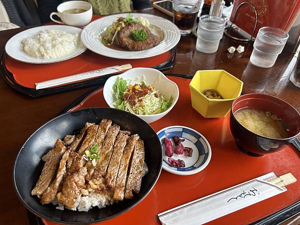 今天點了牛排定食(¥1150)與和風漢堡排(¥1100)兩道菜。隨餐有附上不同的湯品。牛排還有另外的醬菜跟小菜