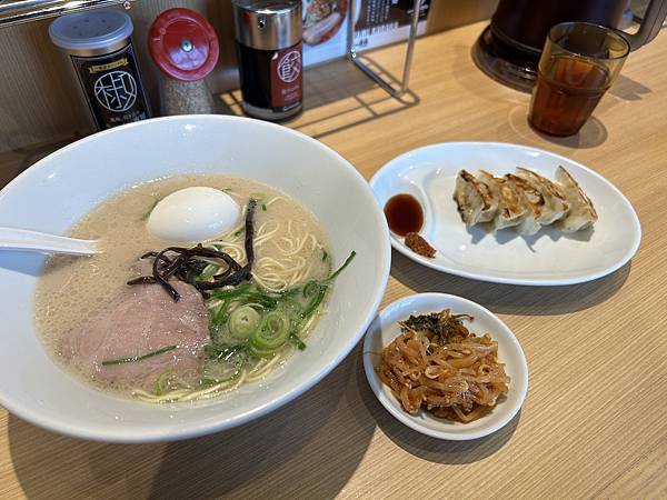 因為客人還不多的關係,拉麵和煎餃很快就上桌了。開動前還先去了旁邊配料台拿了些辣豆芽跟高菜配著一起吃。拉麵湯頭一入喉就是濃郁又不過鹹的湯底,搭配上細麵一起享用,入口的感覺非常舒服,配料的半熟蛋、叉燒兩片和木耳絲,也都各司其職,讓整碗拉麵達到了一個很好的平衡感。吃過一輪後再把辣豆芽和高菜放入麵中幫湯底做個換味,也增加了在用餐過程中的樂趣。煎餃則是份量偏小,但口味也有中上水準,確實更像是吃麵時的點綴