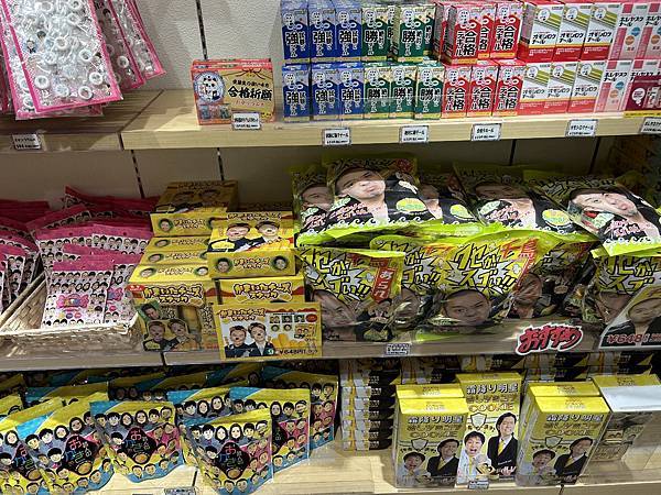 在難波花月裡面有一間販賣各式搞笑藝人紀念商品的禮品店,逛完之後覺得真是太厲害了,萬物皆可商品化。從基本的藝人貼紙,到印章、資料夾、公仔、餅干、零食,應有盡有。而且店內的客人絡繹不絕,一堆年輕人三五成群,一邊看著商品一邊開心地在討論哪個藝人這樣那樣的