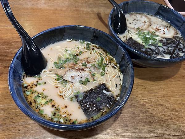 拉麵湯底是經典的熊本豚骨加上炒到焦香的黑蒜末,湯頭濃醇帶有蒜焦香。麵體是細麵,餐廳有一個角落是專門製麵的麵工房,口感軟硬適中,細麵也非常好地吸附了豚骨湯頭。搭配口感脆口的叉燒、筍乾和木耳,整體相當和諧好入口。辣子麵原本以為會是像辣子雞丁、哨子麵那種紅通通的超辣餐點,但其實只是在拉麵的基礎上加上辣油點綴,辣度大概就是比胡椒再辣一點點而已