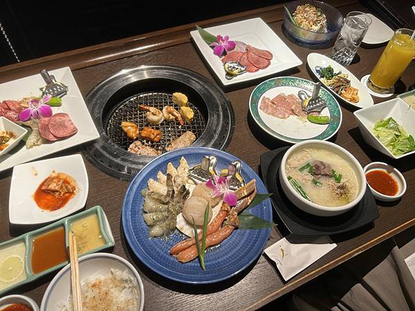 湯麵味道濃厚溫醇、細麵的口感偏軟,很溫柔的味道。冷奴豆腐上面有切得細碎的洋蔥,外觀和口感跟一般的洋蔥不太一樣,也幾乎不會嗆辣,感覺是更高級的品種。J コース 的牛肉口感相當軟嫩、牛舌香氣十足。海鮮則是今晚的主秀,剝殼開背的鮮蝦吃起來方便又好吃;干貝烤完裡面還說軟嫩多汁;飽滿的蟹腳則是 Q 彈又鮮美。吃完主餐後還附上了冰淇淋和熱茶為今天的饗宴劃下完美的句點