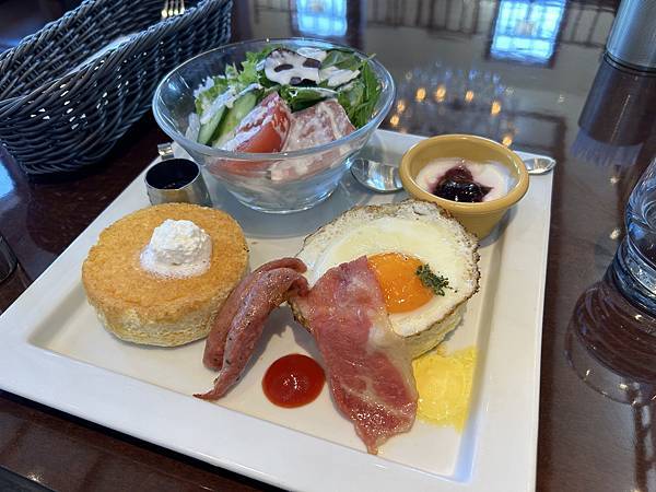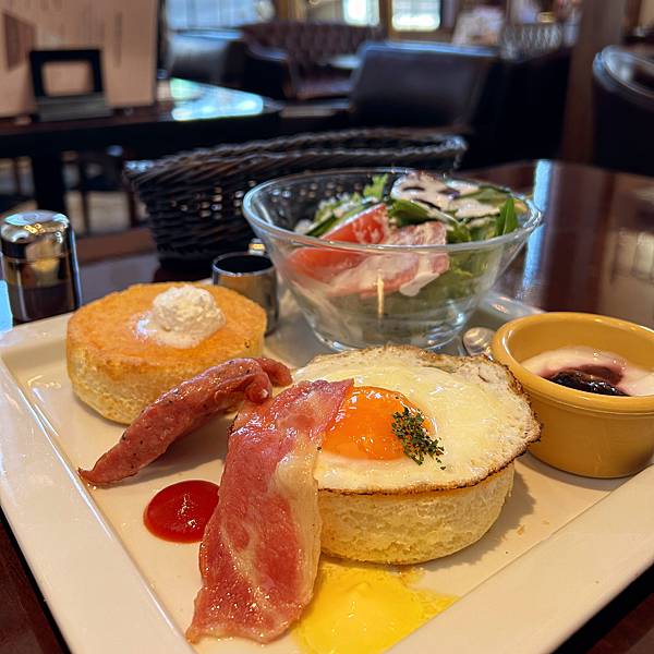 今天點的是早餐菜單的 パンケーキサクラプレート(¥1000)。星乃招牌的舒芙蕾厚鬆餅、搭配上溏心太陽蛋、培根和德國香腸,鹹甜交錯的節奏喚醒了早晨的味蕾。有番茄、黃瓜和火腿片的優格醬沙拉則是正常發揮,爽脆的蔬菜在鬆餅和肉品之外提供了很好的清爽口感