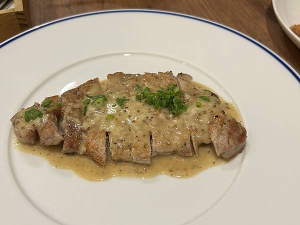 第四道端上桌時,乍看以為是雞腿排,仔細一看才發現原來是煎豬排