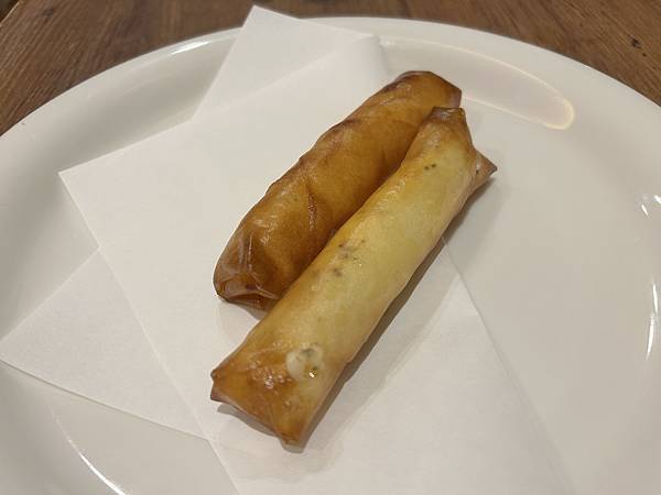 這道菜上來時第一眼的感覺是覺得擺盤有點陽春,就這樣在大白盤上放上兩根直挺挺的春捲