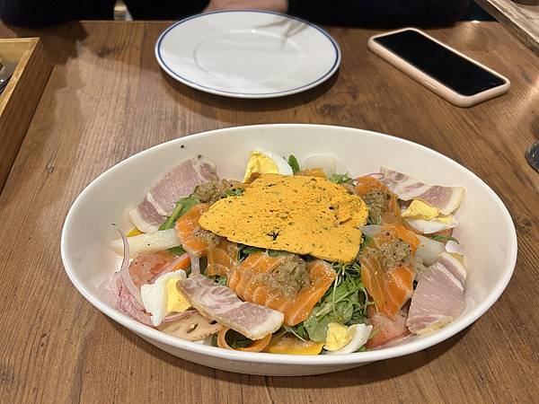 第一道是沙拉。上桌時豐富的配料讓人幾乎看不到綠色的生菜